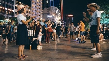 | Le groupe de sourds-muets se produit dans l'avenue piétonne Nguyên Huê. |