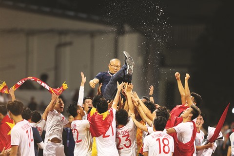 | L’entraîneur sud-coréen Park Hang-seo porté en triomphe par ses joueurs vietnamiens, champions d’Asie du Sud-Est. |