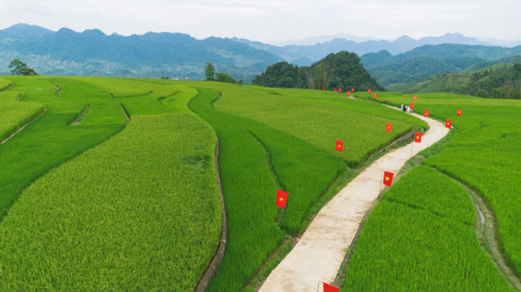 Réalisée début août par l’administration locale et l’Union de la jeunesse, cette installation s’étend sur 23 ha de cultures en terrasses. Le rouge éclatant des drapeaux contraste avec le vert tendre des champs de riz et les collines environnantes, composant une fresque spectaculaire rapidement devenue un lieu de "check-in" incontournable.