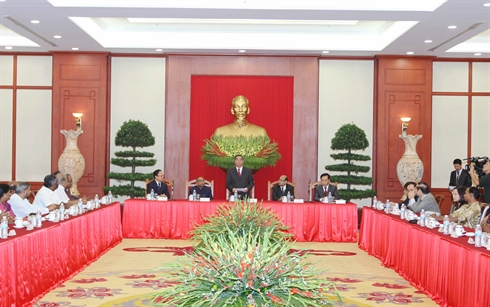 | Le permanent du secrétariat du CC du PCV, Lê Hông Anh (debout), reçoit le 21 octobre à Hanoi la délégation indienne participant au 6e Festival d'amitié populaire Vietnam-Inde. |