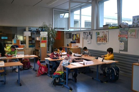 | Des écoliers portent un masque de protection en classe dans une école primaire de Dortmund, le 22 février en Allemagne |