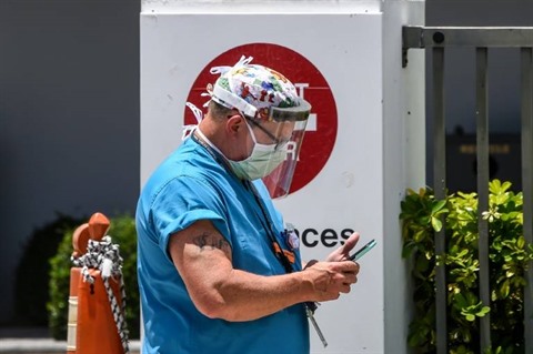 | Un soignant regarde son téléphone à l'extérieur du service des urgences de l'hôpital de Coral Gables près de Miami le 30 juillet en pleine épidémie de coronavirus. |