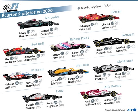 | Les écuries et pilotes de la saison 2020 de formule 1. |