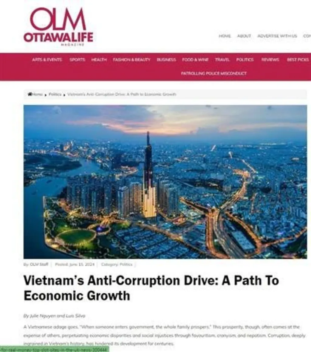 Dans leur récent article publié dans le magazine canadien Ottawa Life, les experts affirment que ces dernières années, la lutte du Vietnam contre la corruption s'est intensifiée, marquée par des affaires très médiatisées qui ont fait la Une des journaux.