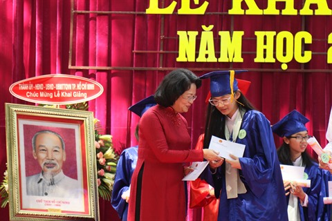 | La vice-présidente de la République, Dang Thi Ngoc Thinh, remet des satisfecits aux élèves du lycée Lê Quy Dôn |