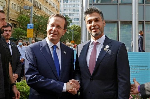 | Le président israélien Isaac Herzog (gauche) serre la main du premier ambassadeur émirati en Israël, Mohamed Mahmoud Fateh Ali Al-Khaja, lors de l'inauguration de son ambassade à Tel-Aviv, le 14 juillet. |