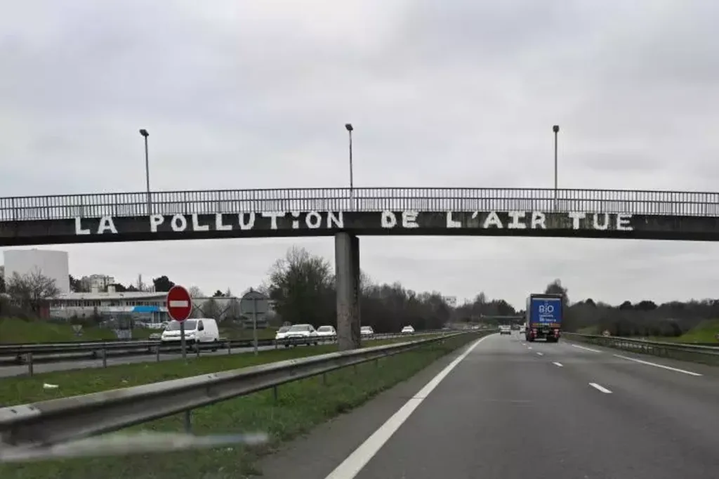 | Le message "la pollution tue" est écrit sur un pont enjambant la rocade de Rennes, le 12 janvier. |