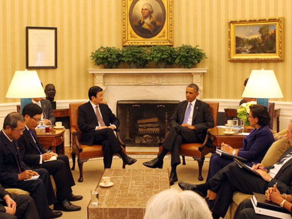 | En juillet 2013, le président Truong Tân Sang (gauche) effectue une visite aux États-Unis sur invitation du président Barack Obama. |