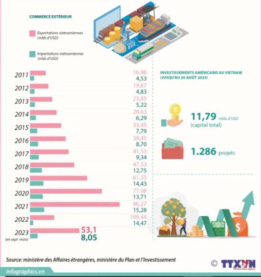 Vingt-huit ans après l'établissement officiel des relations diplomatiques (1995-2023), les visites de hauts dirigeants des deux pays ont créé des jalons importants permettant aux deux pays de "mettre de côté le passé, surmonter les différences, promouvoir les similitudes, et regarder vers l’avenir", pour la coopération égale et d’intérêt commun. Les relations Vietnam - États-Unis ont connu des développements intégraux et substantiels, s'approfondissent de plus en plus.