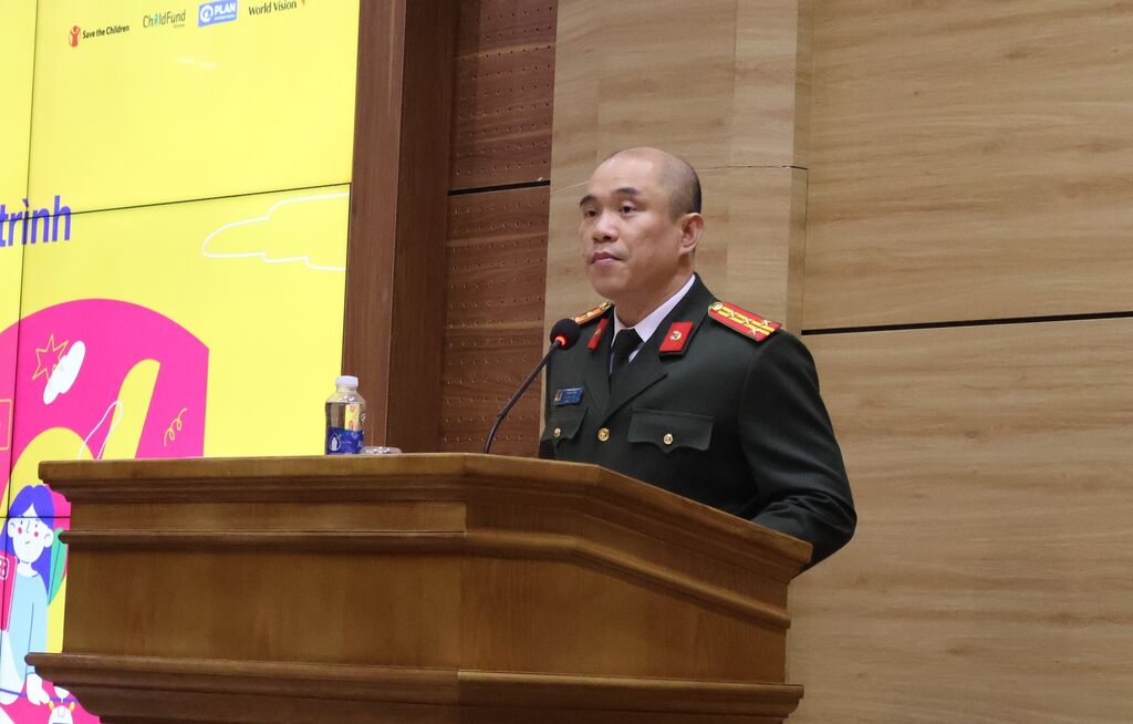 | Le colonel Hà Van Bac à la cérémonie destinée à recueillir les avis des enfants sur le futur Programme de protection et de soutien des enfants dans l'environnement numérique pour la période 2026-2030. Photo : Hanh Quyên/VNA/CVN |