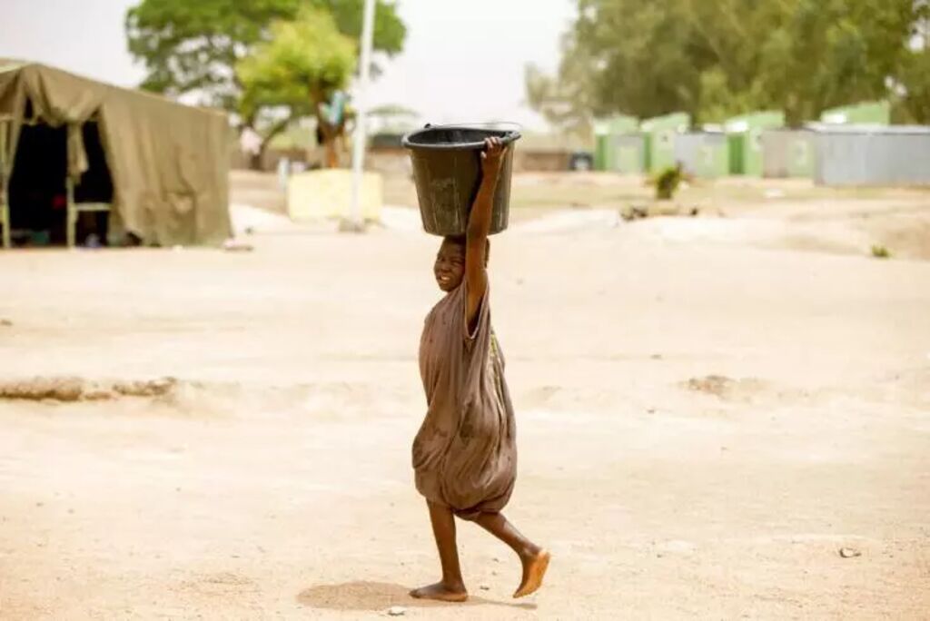| Un enfant porte un seau à Yola, au Nigeria, près du lac Tchad, le 22 avril 2016. |