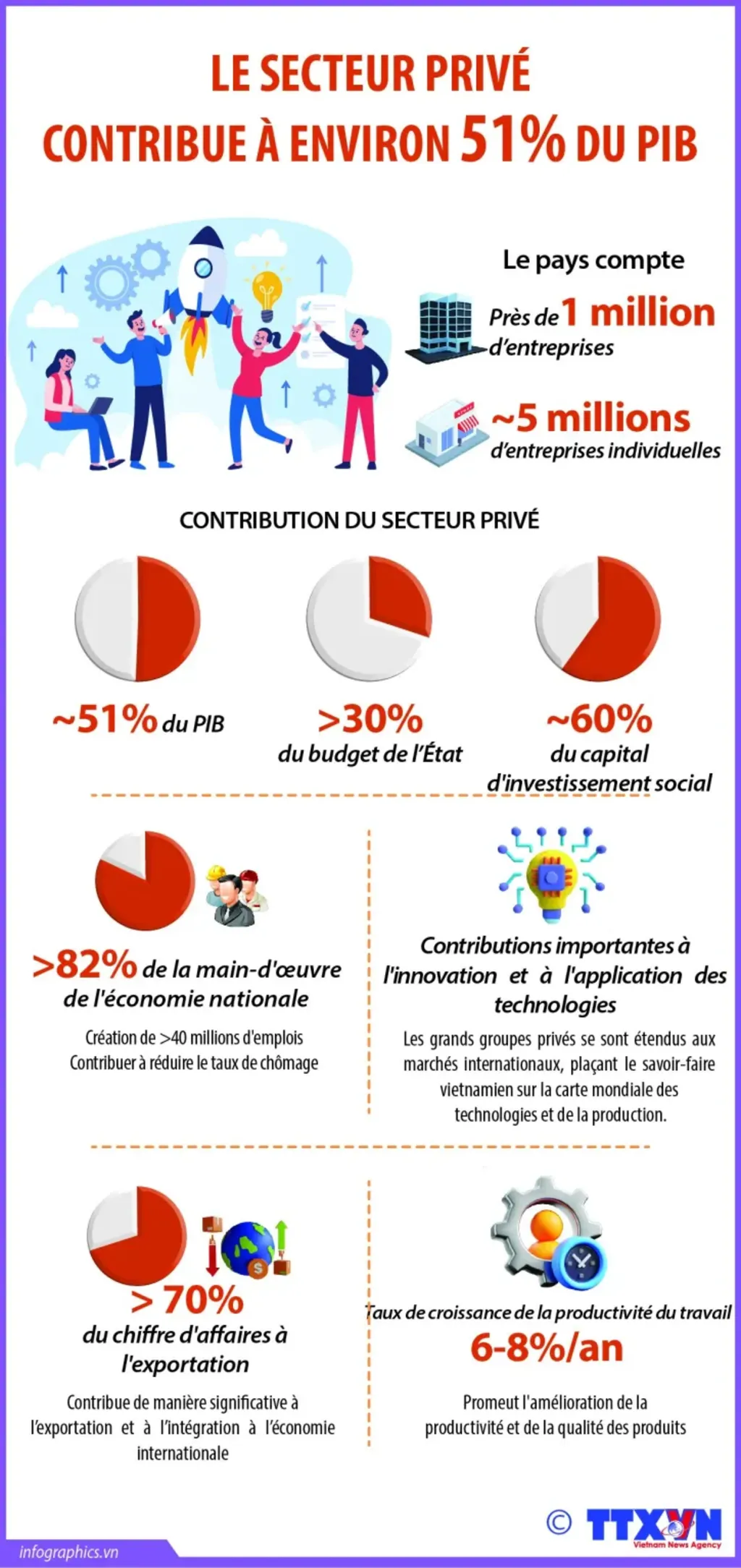 En conclusion, le secteur économique privé s'affirme comme un acteur incontournable du développement socio-économique du Vietnam, contribuant de manière significative à la réalisation des objectifs stratégiques du pays. Lors de la réunion du 7 mars 2025 avec la Commission centrale des politiques et des stratégies sur le développement de l'économie privée, le secrétaire général Tô Lâm a souligné que l'économie privée constitue le moteur le plus important de la croissance économique.