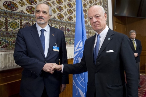 | L'émissaire de l'ONU pour la Syrie, Staffan de Mistura (droite) et l'ambassadeur syrien à l'ONU et chef de la délégation gouvernementale, Bachar al-Jaafari, le 29 janvier 2016 à Genève |
