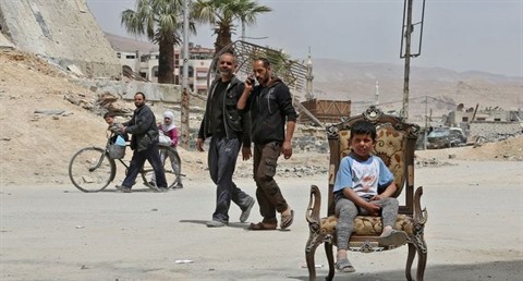 | Des civils dans une rue de Douma, ancienne ville opposante située à l'est de Damas et reprise par les forces progouvernementales syrienne. |