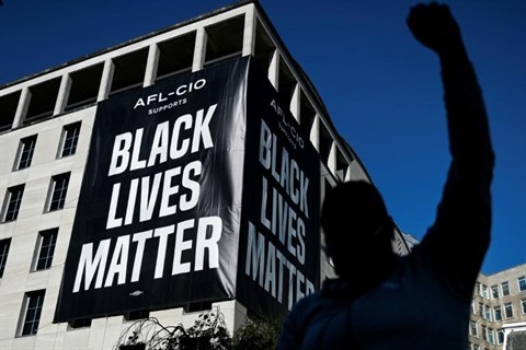 | Une banderole "Black lives matter" sur la façade d'un immeuble, le 20 avril à Washington. |