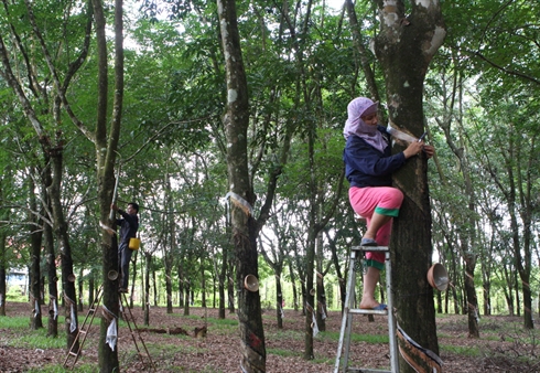 | Récolte du latex de l'hévéa à la compagnie Phù Riêng (Groupe industriel du caoutchouc du Vietnam). |