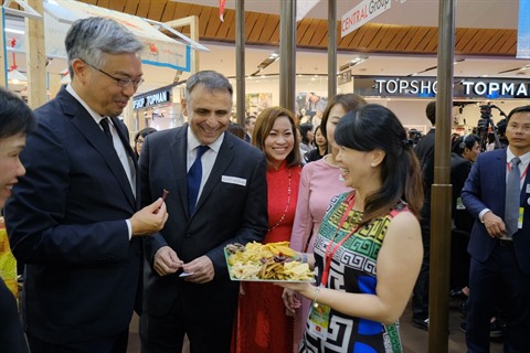 | Les visiteurs sont invités à goûter des fruits séchés vietnamiens présentés lors de l'événement. |
