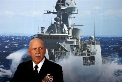 | Le commandant de la Flotte du Pacifique, l’amiral Scott Swift s’assoit devant une grande affiche d’une frégate de la Marine australienne quand il s’adresse à une conférence de presse à l’occasion de l’Exposition internationale maritime du Pacifique 2015, à Sydney, en Australie, le 6 octobre 2015. |