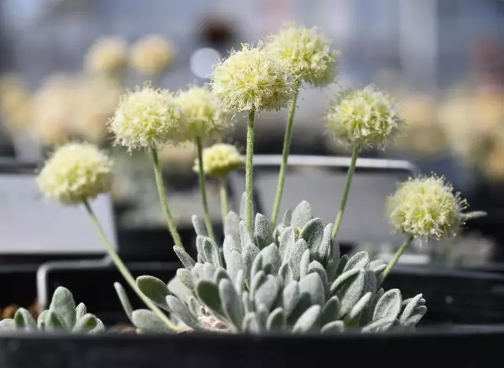 | Un spécimen de "Tiehm's buckwheat", une fleur unique au monde et menacée par un projet de mine de lithium, cultivé en serre à Gardnerville par l'entreprise Ioneer, le 8 mai dans le Nevada. |