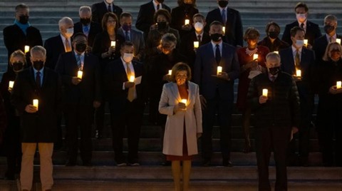| Des élus du Congrès américain lors d'une veillée devant le Capitole de Washington, le 14 décembre, en hommage aux 800.000 morts du COVID-19 aux États-Unis. |