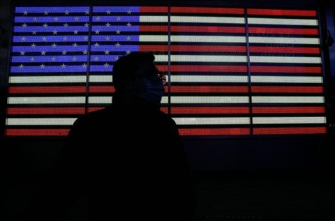 | Une personne devant un panneau affichant le drapeau américain à Times Square, à New York, le 12 janvier 2022. |