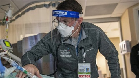 | Un médecin s'occupe d'un patient atteint du COVID dans un service de réanimation dans le Connecticut, aux États-Unis, le 18 janvier 2022. |