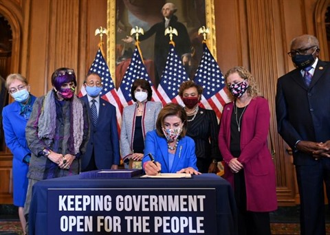Nancy Pelosi signe un document évitant la paralysie de l'État fédéral au Capitole, le 30 septembre à Washington. Photo : AFP/VNA/CVN |