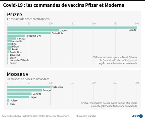 | Nombre de doses commandées pour les vaccins Pfizer et Moderna, données du Duke Global Health Institute Center au 20 novembre. |