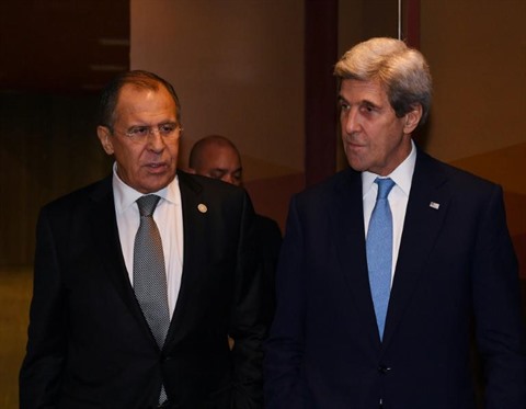 | Les chefs de la diplomatie américaine et russe, John Kerry (droite) et Sergueï Lavrov, le 17 novembre à Lima. |
