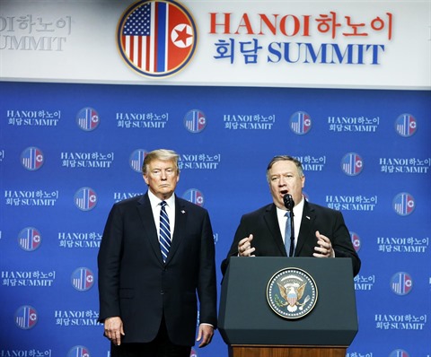 | Le secrétaire d'État américain Mike Pompeo (droite) et le président américain Donald Trump, le 28 février à Hanoï. |