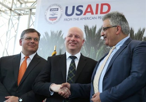 | Jason Greenblatt (centre), l'émissaire du président Donald Trump pour le Proche-Orient, serre la main du directeur de l'Autorité palestinienne de l'eau, Mazen Ghoneim, le 15 octobre à Jéricho, en Cisjordanie. |