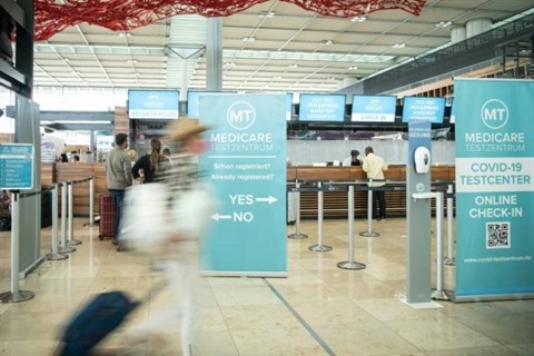 | Un panneau indiquant un centre de dépistage du COVID-19 à l'aéroport international de Berlin, le 28 juillet. |