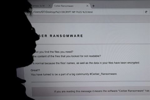 | Un chercheur devant un écran géant d'un ordinateur infecté par un système de ransomware au Laboratoire de haute sécurité de l'INRIA à Rennes, le 3 novembre 2016. |