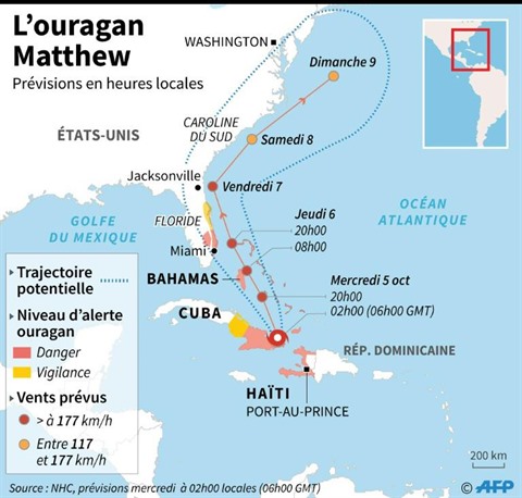 D'ici jeudi 6 octobre, Matthew est attendu près de la côte Est de la Floride mais les prévisionnistes n'étaient pas en mesure à ce stade de déterminer si le cœur allait simplement affleurer ou toucher directement la terre américaine. Ce devrait toujours être un ouragan "majeur", soit au moins catégorie 3 (vents supérieurs à 178 km/h).