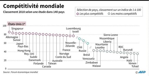 Pour l'édition 2018 de son Rapport sur la compétitivité mondiale, le WEF, qui réunit chaque année en janvier l'élite économique et politique dans la station de ski huppée de Davos (Est de la Suisse), a utilisé "une toute nouvelle méthodologie afin de bien saisir la dynamique de l'économie mondiale en ces temps de quatrième révolution industrielle".