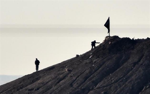 | Des membres présumés du groupe État islamique près d'un drapeau du mouvement jihadiste, à proximité de la ville de Kobane, en Syrie, le 7 octobre 2014. |