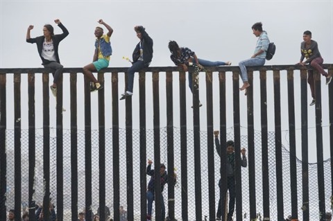 | Des migrants qui ont participé à la caravane des migrants escaladent la barrière entre la frontière mexicaine et les États-Unis, le 29 avril à San Ysidro, en Californie. |