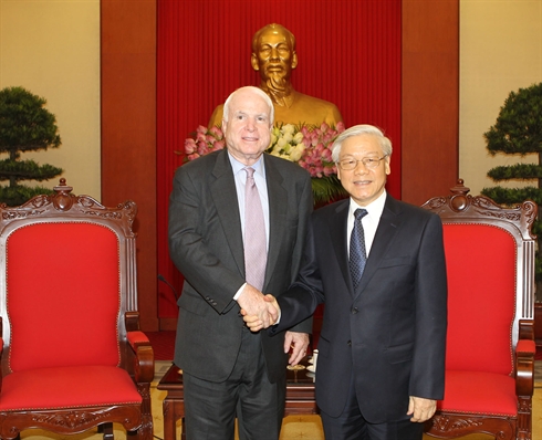 | Le secrétaire général Nguyên Phu Trong (droite) et le sénateur américains John McCain, le 8 août, à Hanoi. |
