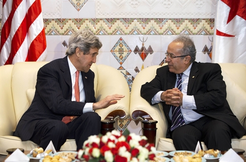 | Entretien entre le secrétaire d'État américain John Kerry (gauche) et son homologue algérien Ramatane Lamamra, le 3 avril à Alger. |