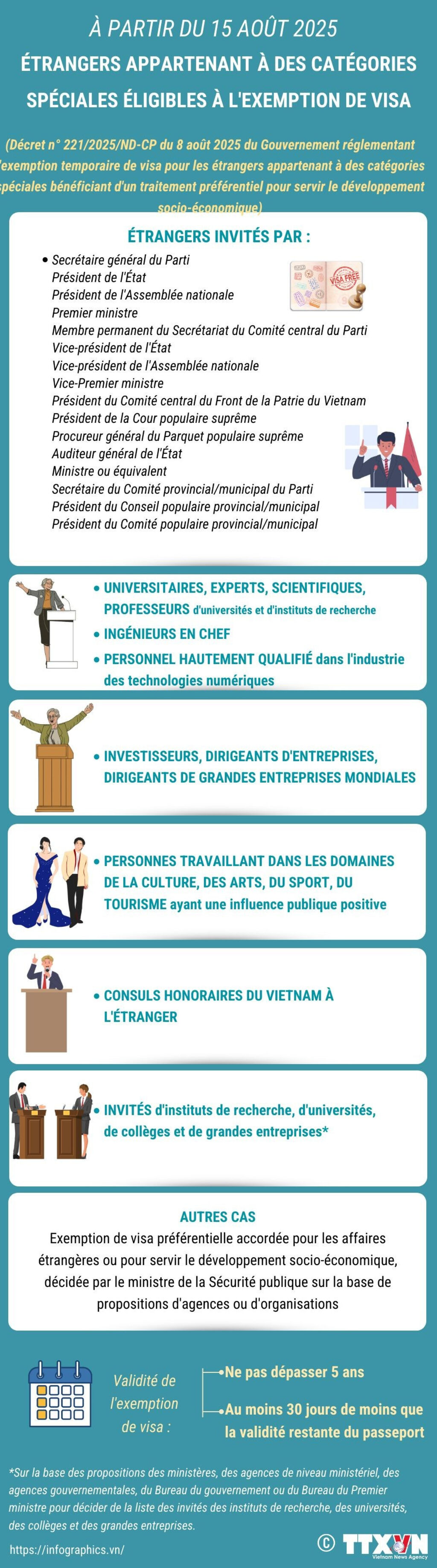 Le Décret N°221 du 8 août 2025 du gouvernement réglemente l'exemption temporaire de visa pour les étrangers appartenant à des catégories spéciales bénéficiant d'un traitement préférentiel pour servir le développement socio-économique.