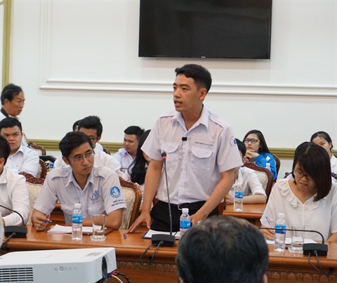 | L’étudiant Huynh Tân Khuong (debout), de l'École supérieure des sciences naturelles, relevant de l'Université nationale de Hô Chi Minh-Ville, présente ses opinions. |