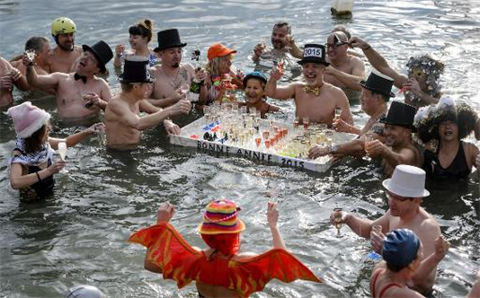| De nombreuses personnes trinquent à la Nouvelle Année dans le lac Léman, à Genève, le 1er janvier. |
