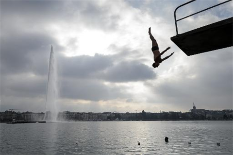 | Un homme plonge dans le lac Léman à Genève pour fêter la Nouvelle Année, le 1er janvier. |