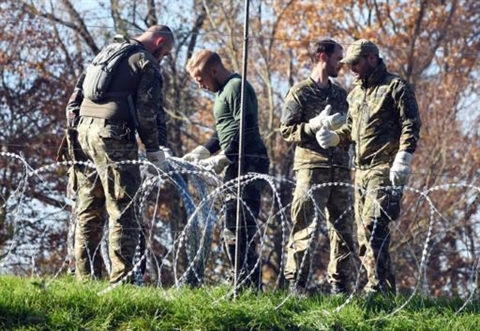 | Des soldats slovènes installent des barbelés le 11 novembre à Sela pri Dobovi près de Brezice à la frontière avec la Croatie |