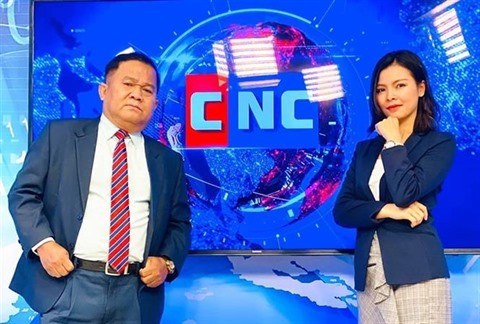 | Khieu Kola (gauche), membre de la direction du Club des journalistes du Cambodge, commentateur international sur CNC et CTN du Cambodge. |