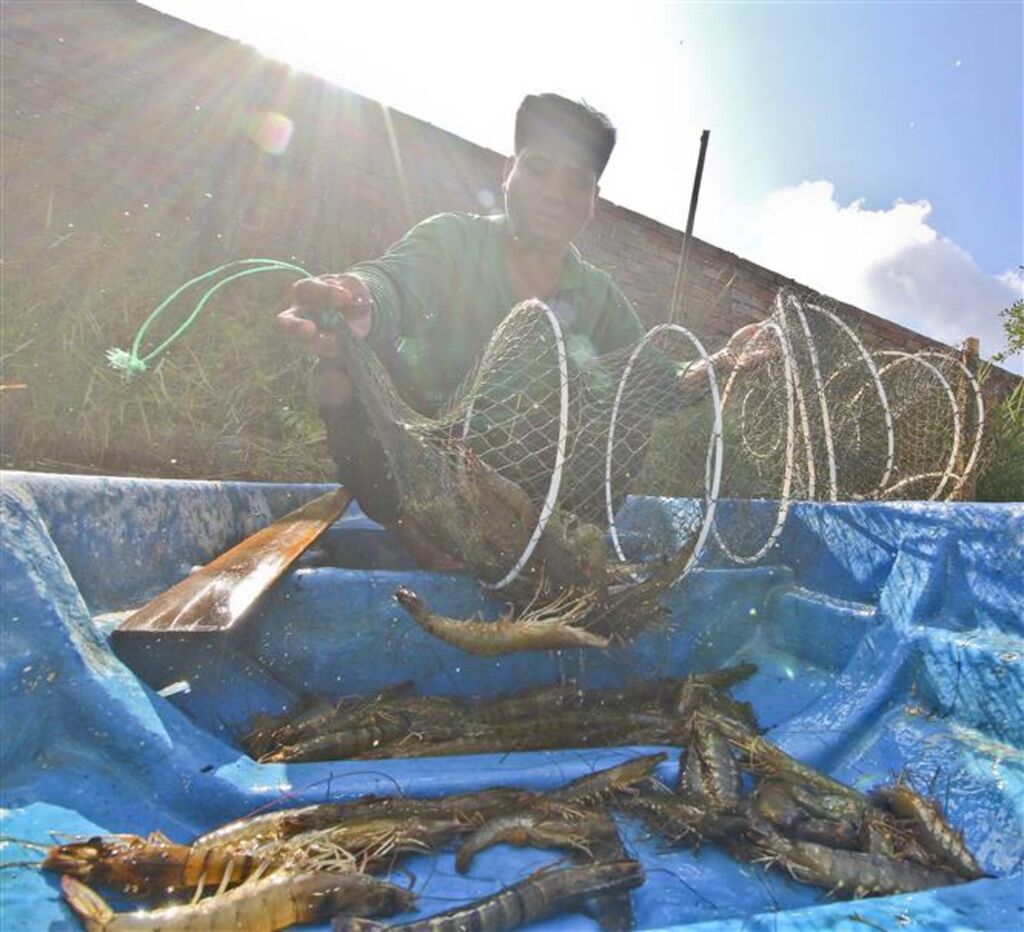 | Récolte de crevettes à Hâu Giang (Delta du Mékong). |