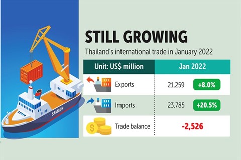 Le ministère thaïlandais du Commerce a annoncé le 2 mars que les exportations dédouanées du pays s'élevaient à 21,3 milliards d’USD, les importations augmentant de 20,5% à 23,7 milliards d’USD, entraînant un déficit commercial de 2,52 milliards d’USD.