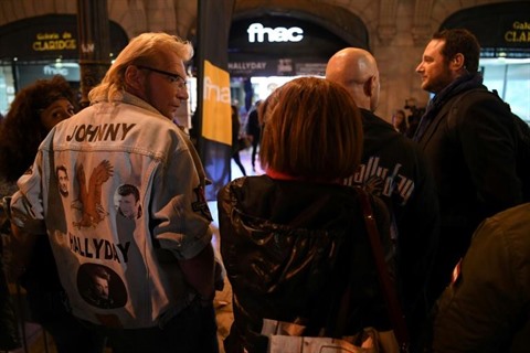 | Des fans font la queue en attendant la mise en vente à minuit de l'album posthume de Johnny Hallyday à la FNAC des Champs-Élysées à Paris, le 19 octobre. |