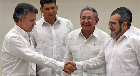 Un peu plus tôt, les deux hommes s'étaient entretenus pendant une demi-heure, une rencontre inédite en compagnie du président cubain Raul Castro, pour donner un élan final à la résolution du plus ancien conflit d'Amérique latine, qui a fait en un demi-siècle au moins 220.000 morts.