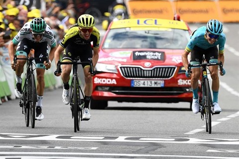 Peyresourde et la Hourquette d'Ancizan, les deux premiers cols des Pyrénées, classés en première catégorie, ont servi de simple galop d'essai. Le mieux classé des membres de l'échappée-fleuve d'une quarantaine de coureurs (Van Avermaet) était pointé à près d'un quart d'heure! Pour gagner sur le Tour, une "première" pour lui à sa quatrième participation, Yates a dû régler au sprint deux solides coureurs, l'Espagnol Pello Bilbao, deux fois vainqueur d'étape sur le dernier Giro, et l'Autrichien Gregor Mühlberger, qui avait inquiété Alaphilippe sur le Dauphiné (photo-finish).